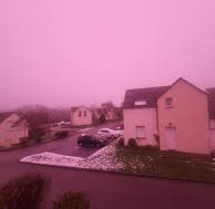 Les lumières du Soleil, qui nous paraissent rougeâtre le matin, se sont combinées aux nuages chargés de cristaux de neige de la Normandie, ainsi qu’à la neige sur le sol, qui diffusaient très fortement cette couleur rose pour créer un monde de Barbie temporaire.
