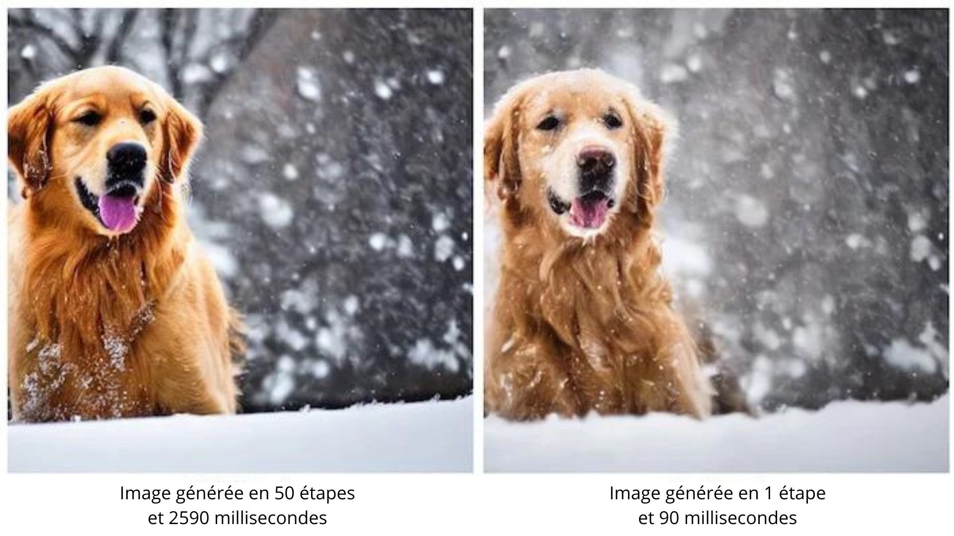 Ainsi, les images sont générées 30 fois plus rapidement tout en réduisant le risque de rendus étranges. La puissance de calcul nécessaire diminue également grâce à la réduction du nombre d’étapes. 💻